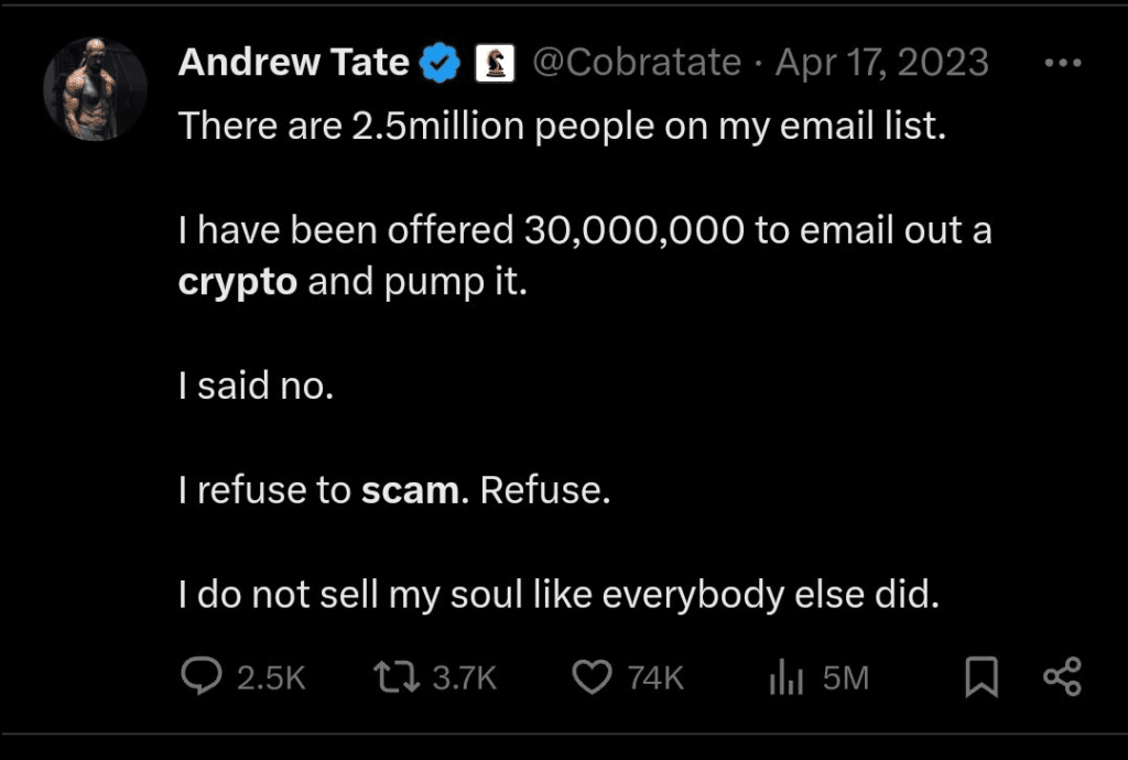 — Watcher.Guru (@WatcherGuru) February 1, 2024Część obserwatorów zarzuciła Tate’owi hipokryzje. Celebryta przez lata wystrzegał się crypto, jak ognia. Problemy finansowe? Potrzeba zastrzyku gotówki? Dodatkowy sposób na biznes? Co kierowało Andrew Tatem? Tate dodał, iż wykona plan, jeżeli post otrzyma 50 000 retweetów. Na początku 2023 roku Tate informował, że… Nie zdecyduje się okradać swoich fanów jak „każdy inny influencer”. Nie chciał być kojarzony z kryptowalutami.