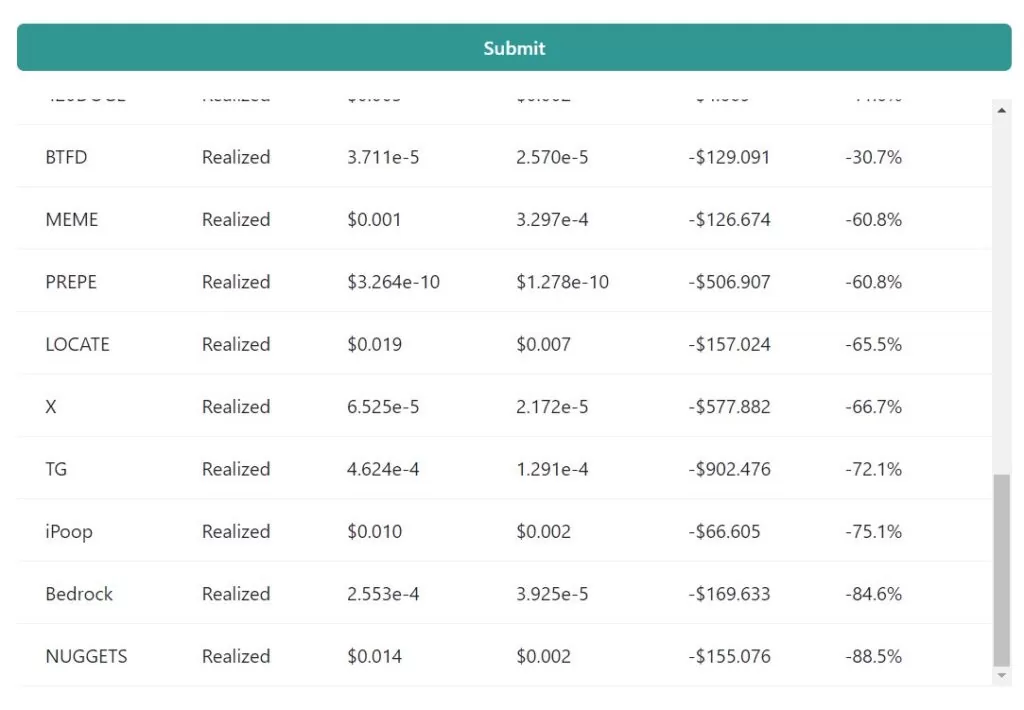 „Mądry trader” mógł jednak pochwalić się nie tylko realizowaniem zysków i typowaniem szycztów, ale także zdyscyplinowanym podejściem do zarządzania ryzykiem i swoim kapitałem. Średnia strata na transakcji wyniosła anonka zaledwie 100 USD, a największą klapą okazał się być token $TG, gdzie nasz bohater zarejestrował stratę w wysokości 900 dolarów.