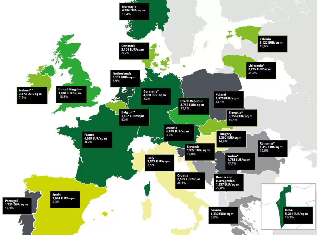 Źródło: DeloittePatrząc na wzrosty r/r dynamika cen nieruchomości w Polsce wciąż… Odstaje od 'Europy wschodniej’ choć zdecydowanie bije zachodnie kraje. Rekordowe wzrosty widać w Czechach, gdzie nieruchomości wzrosły o ponad 12%. Pobiła je jednak Słowacja z 19,1% wzrostem r/r. Ceny na Litwie, Estonii, Węgrzech, Serbii, Bośni i Chorwacji wzrosły również potężnie z rekordową Bośnią (27% wzrost r/r!). Izrael? Tam cena za m2 przebija już licznik i sięga 5700 EUR za m2. To blisko 40% więcej niż ceny w… Norwegii! Gdzie nawiasem mówiąc wzrost także był dwucyfrowy (największy spośród państw rozwiniętych). O dziwo to nie Chorwacja przewodzi w rankingu, z 20,1% wzrostem. Pobiła ją Bośnia, gdzie wzrosty napędza efekt niskiej bazy. Średnia za m2 w Bośni i Hercegowinie to wciąż mniej niż 1300 EUR!