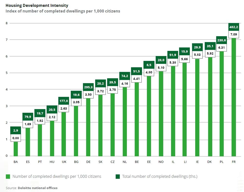 Polska nieruchomościami stoi, zajęła drugie miejsce w Europie pod względem oddanych mieszkań na 100 mieszkańców. Wyprzedziła nas tylko Francja, po piętach depczy nam Dania.