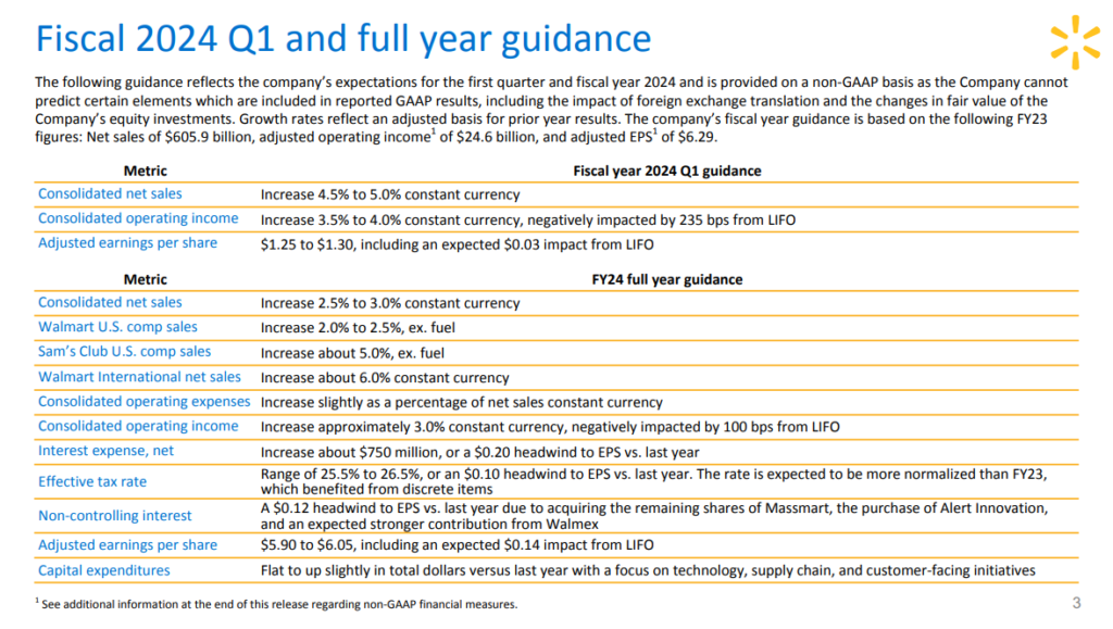Według prognoz spółki, oczyszczony ze zdarzeń jednorazowych wynik netto na akcję będzie wynosić 5,90$ – 6,05$. Wydatki inwestycyjne mają pozostać na niezmienionym poziomie pod względem nominalnym. Walmart będzie dużo inwestował w automatykę, rozwiązania technologiczne oraz łańcuch dostaw.