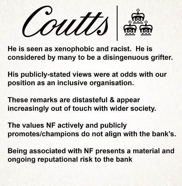 Dyrektor grupy NatWest, dama Alison Rose, po ujawnieniu faktu kierowania się przez bank Coutts antypatiami politycznymi w stosunku do klientów wystosowała formalne przeprosiny do Nigela Farage’a. Przeprosiny owe jednak, zdaniem prawników polityka, nie wspominały słowem o sprawie nielegalnego przekazania dokumentów mediom