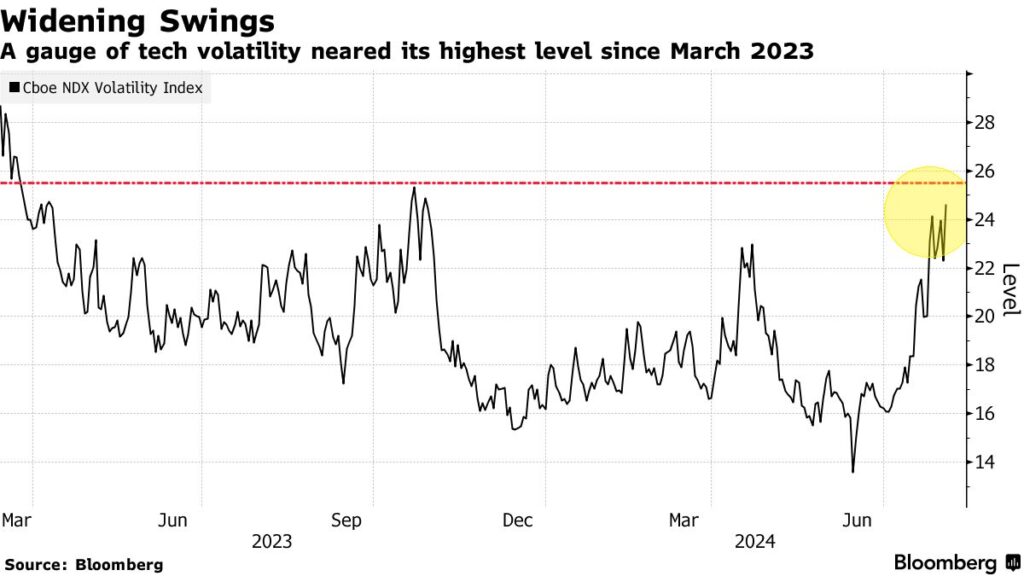 Indeks zmienności VIX wzrosł do poziomów niewidzianych od marca 2023 roku. Źródło: Bloomberg