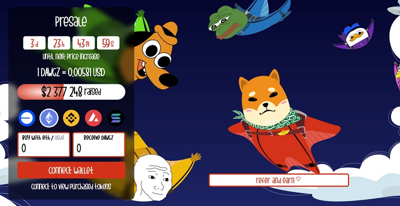 W takiej sytuacji można spodziewać się, iż przedsprzedaż przyspieszy, a już dziś wygląda bardzo przyzwoicie. Twórcom udało się już zebrać ponad 2,3 mln USD. Niewątpliwie wpływ na to ma bardzo niska cena tokenów. Aktualnie za jedną monetę $DAWGZ zapłacić należy tylko 0,00581 USD. W tej cenie moneta będzie dostępna jeszcze do godzin porannych najbliższego wtorku 9 lipca. Na kolejnym etapie fazy ICO nieznacznie urośnie.