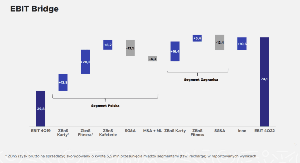 źródło: BenefitWarto również zwrócić uwagę na marżę EBIT, która w IV Q 2022 była znacznie wyższa niż w czasie “przed COVID-19”. Również cały 2022 rok był o wiele lepszy niż 2019. Marża EBIT w ubiegłym roku wyniosła 11,1% vs 10,2% w 2019 roku. Jak widać poprawa zysku brutto dotyczyły wszystkich segmentów w Polsce jak i na rynkach zagranicznych. W Polsce największy wzrost zysku brutto na sprzedaży miały kluby fitness (+20,2 mln zł r/r) oraz sprzedaż kart (+13,8 mln zł r/r).