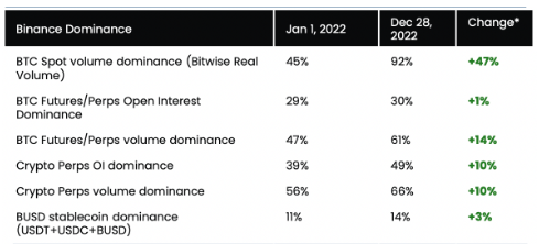 Binance odpowiada w tej chwili za około 75% globalnego rynku handlu kryptowalutami i choćby 92% spotowego obrotu BTC. Na początku 2021 roku udział giełdy w handlu BTC wynosił 45% ale wyeliminowanie opłat handlowych w czerwcu i upadek konkurencyjnego FTX w listopadzie, pomogło sprowadzić nowych klientów do Binance. Analitycy Arcane napisali: „Bez względu na to, jak patrzysz na to pod względem aktywności handlowej, Binance jest rynkiem kryptowalut. Po zniesieniu opłat handlowych dla swoich par spotowych BTC tego lata, Binance całkowicie wyprzedził cały udział w rynku spot”. Raport innej firmy, CryptoCompare wykazał, iż ogólny udział Binance w rynku kryptowalut na koniec roku wyniósł 66,7%. Podczas gdy Binance jest zdecydowanie największą giełdą kryptowalutową pod względem wolumenu obrotu od kilku lat również inne liczby sugerują dominację na poziomie monopolu. Na drugim miejscu widzimy Coinbase.