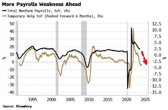 — FXHedge (@Fxhedgers) August 21, 2023Zatrudnienie tymczasowe w Stanach Zjednoczonych tj. historyczny, dobry prognostyk zmian na rynku pracy i gospodarce, spada od sześciu miesięcy z rzędu i sygnalizuje nadchodzącą recesję. Niektórzy tego 'nie kupują’. Nie oczekują szerokiego pogorszenia koniunktury. Według biznesowych ankiet dyrektorzy twierdzą, iż spadek zatrudnienia może oznaczać stopniowe ochłodzenie przegrzanego rynku pracy. Oraz… być szansą na miękkie lądowanie gospodarki. Wszyscy łudzą się i są w błędzie? Najgorsze dopiero przed nami? Muzyka przestanie grać?