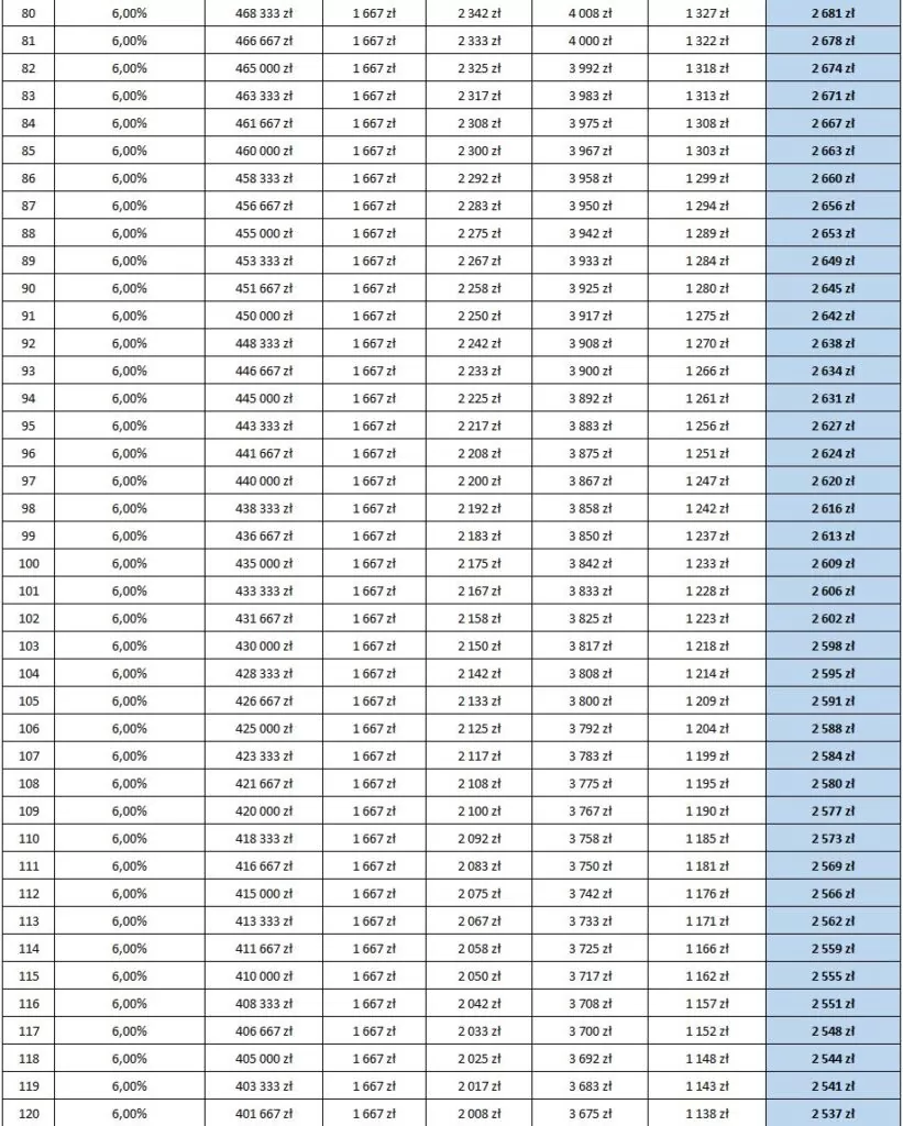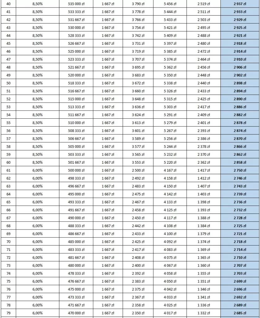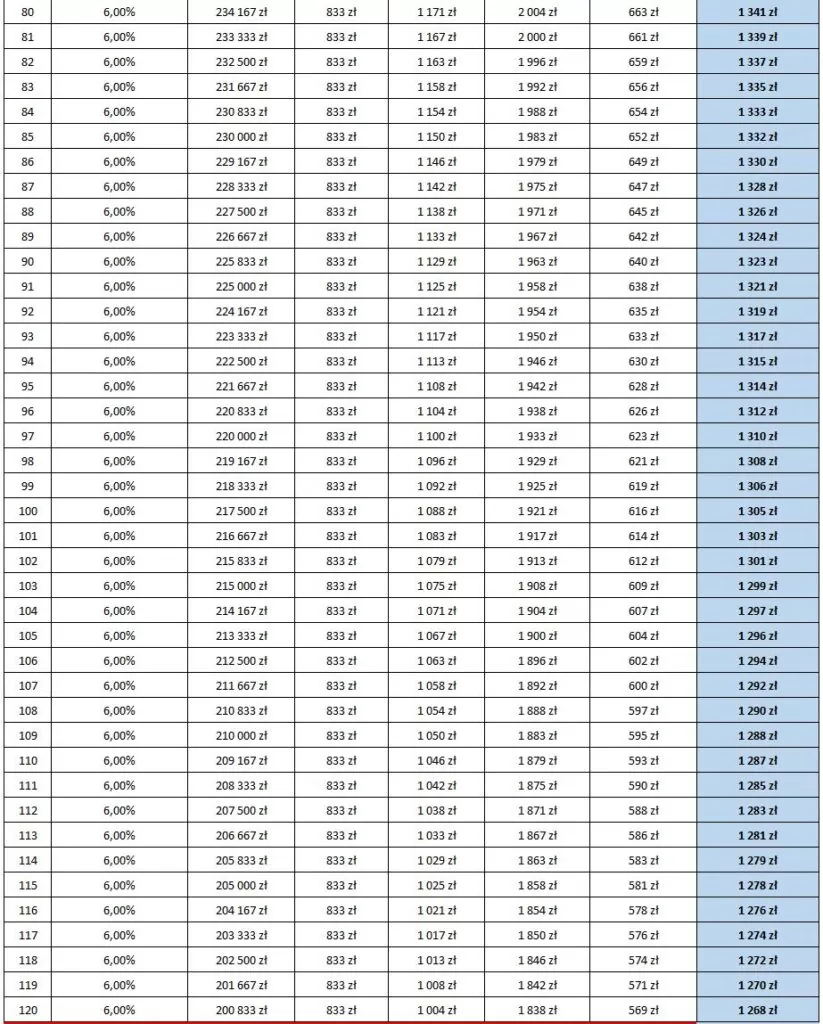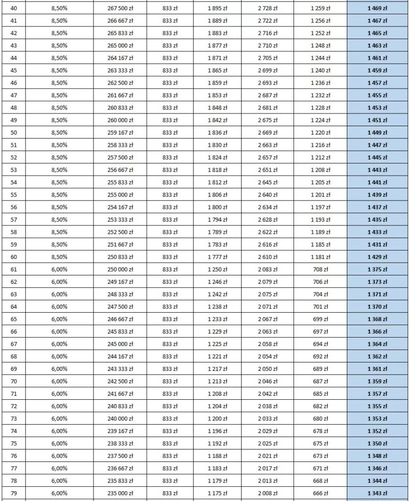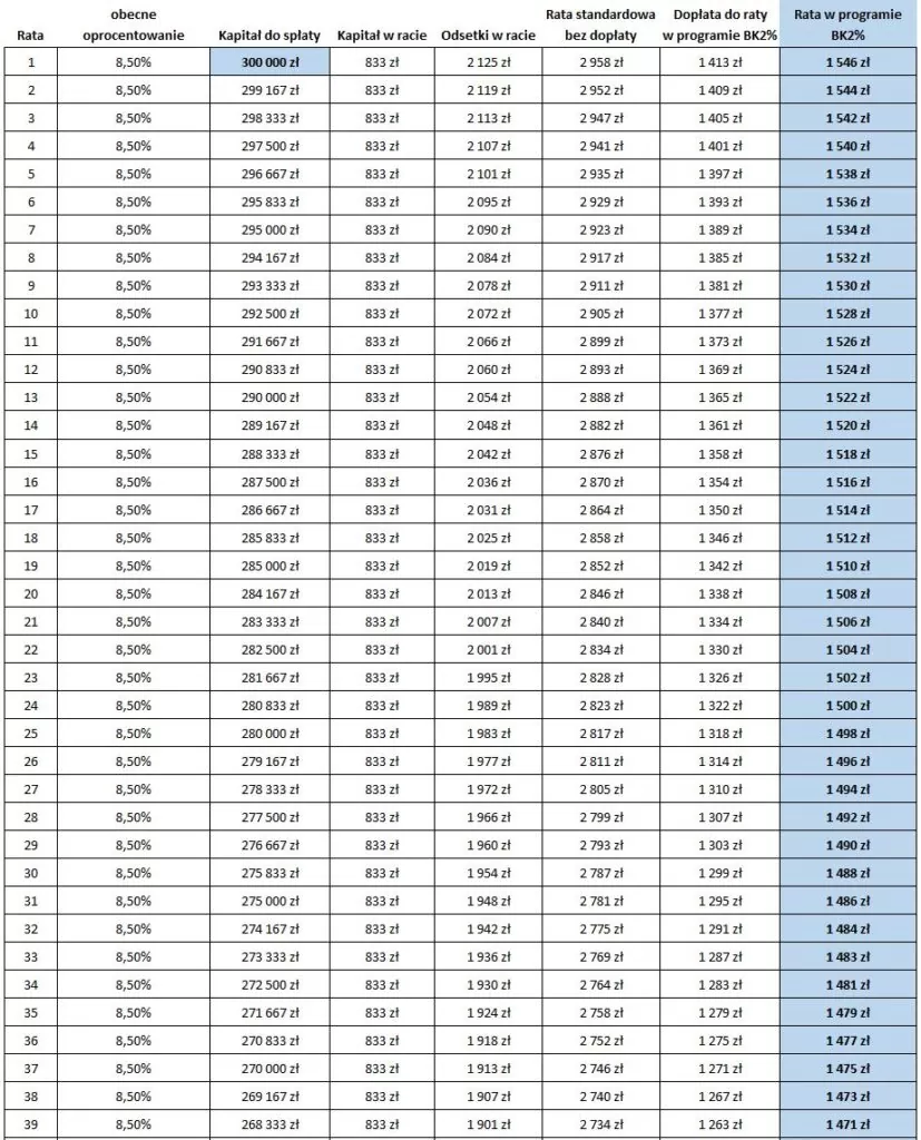 Oto harmonogram spłat dla kwoty 300 tys.: