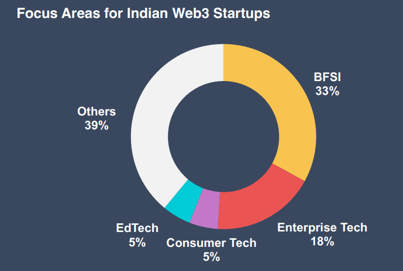 Większość startupów Web3 w Chinach operuje w niszowych, bliżej nieokreślonych sektorach (39%) oraz sektorze BFSI (Banking, Financie, Insurance) wskazując na wiodącą rolę produktów i usług finansowych w rozwoju 'nowego internetu’ oraz technologii blockchain. Sektorami nieokreślonymi może być technologia NFT czy projekty w fazie koncepcyjnej. Wysokie miejsce zajmuje też rozrywka i technologia konsumpcyjna. Źródło: Cointelegraph, Zinnov conXT Reserach & Analysis