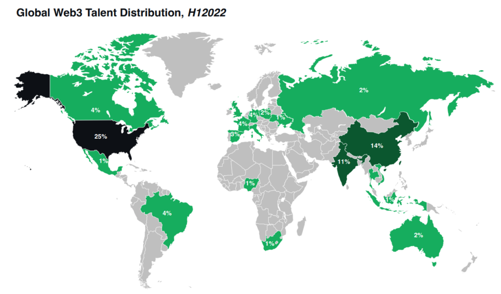 Wykres pokazuje, iż wciąż najwięcej talentów Web3 znajduje się w USAm co w połączeniu z Kanadą i Meksykiem (30%) czyni Amerykę Północną hegemonem wśród kontynentów. Imponujące liczby mają jednak również Indie i Chiny, które odpowiadają łącznie za 25%, a patrząc na tempo przyrostu naturalnego (zwłaszcza w Indiach) długoterminowo mogą uzyskać przewagę. Co interesujące wysoko plasuje sie również Polska, która mimo reltywnie niewielkiej liczby ludności odpowiada 2%, i stanowi dla bardziej ludnej Rosji czy przecież świetnie rozwiniętej technologicznie Australii. Źródło: Cointelegraph, OKX, National Association of Software and Service Companies (NASSCOM)Badania NASSCOM pokazują, iż Indie są w tej chwili trzecim największym na świecie graczem Web3 po USA i Chinach, pomaga temu również wysoki wskaźnik adopcji kryptowalut, który na terenie Indii jest jednym z najwyższych na świecie. To musi ciągnać ze sobą rozwój blockchain. Co więcej, Indie wciąż zajmują pierwsze miejsce na świecie, jeżeli chodzi o przekwalifikowanie w najnowszych technologiach, co jest kluczowym wskaźnikiem i motorem wzrostu w przypadku technologii wschodzących, takich jak Web3, blockchain czy metaverse. Dodatkowo rozwój new-tech w Inidach może w najbliższych latach wyprzedzić borykające się ze ostudzonym przyrostem naturalnym, amerykańskimi sankcjami i słabnącą gospodarką Chiny. Około 60% startupów w Inidach rozszerzyło swoją sieć produktów poza kraj.