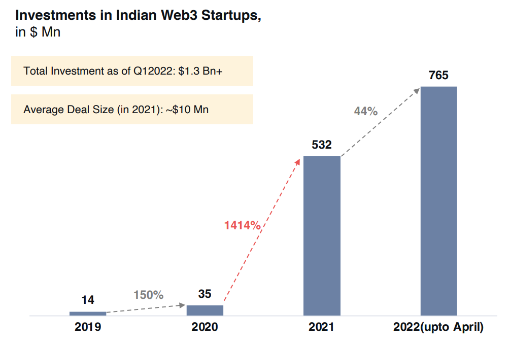 Inwestycje w indyjskie startupy skokowo przyspieszyły na przestrzeni ostatnich lat i co istotne, wzrost wciąż ma miejsce mimo spadków cen kryptowalut. Na przestrzeni 2019 – 2020 miał miejsce imponujący 150% wzrost, jednak już licząc 2020 – 2021 wzrost inwestycji w Web3 wykazał 1414% wzrost (!) i wyniósł 532 mln USD. Średnia wartość kwoty finansowania startupu Web3 w Indiach wyniosła 10 mln USD. W 2022 wyłącznie do kwietnia kwota inwestycji w Web3 wykazała już 765 mln USD mimo trudnej sytuacji rynkowej. Oczywiście dynamika pozostaje zachowana choć zwolniła wobec poziomów z poprzednich lat. Pośrednio ma to związek z naysceniem rynku i naturalny, organicznym rozwojem. Ciężko oczekiwać by rozwój Web3 wrócił do poziomów z 2019 roku gdy zdecydowana większosć projektów była wciąż w wyłącznie konceptualnej, spekulacyjnej fazie bez rzeczywistych produktów i rozwiązań. Źródło: Cointelegraph, USISPF, NASSCO