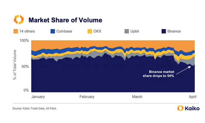 W ciągu zaledwie dwóch burzliwych tygodni Binance, największa giełda kryptowalut na świecie straciła aż 16% udziału w globalnym wolumenie handlowym. Głównym powodem był zdecydowanie medialny pozew amerykańskiej Komisji ds. Obrotu Kontraktami Terminowymi (ang. Commodity Futures Trading Commission – przyp. red.), w treści którego wystosowano w kierunku giełdy oraz jej założyciela, Changpenga Zhao (popularnie zwanego CZ), poważne oskarżenia. Wśród nich pojawiły się zarzuty o nagabywanie, wprowadzanie klientów w błąd oraz fikcyjne praktyki compliance.