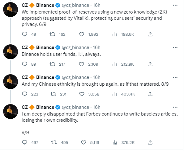 — CZ 🔶 Binance (@cz_binance) February 28, 2023Niechętnie spędzam czas na analizę tego FUD ponownie. Forbes napisał kolejny artykuł FUD z mnóstwem oskarżycielskich pytań, z negatywnymi wrzutkami, celowo źle interpretując fakty. Odnieśli się do niektórych starych transakcji blockchain, które zrobili nasi klienci.