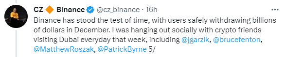 Binance przetrwało próbę czasu, a użytkownicy bezpiecznie wypłacali od nas miliardy dolarów w grudniu. W tamtym tygodniu spędzałem czas towarzysko z przyjaciółmi kryptowalutowymi odwiedzającymi Dubaj codziennie.