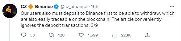 Nasi użytkownicy również muszą najpierw dokonać depozytu na Binance, aby móc wypłacić środki, które są tak samo łatwo identyfikowalne na blockchainie. Artykuł wygodnie ignoruje transakcje depozytowe.