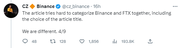 Artykuł usilnie stara się postawić Binance i FTX w jednym szeregu, łącznie z wyborem tytułu całego artykułu. Jesteśmy inni.