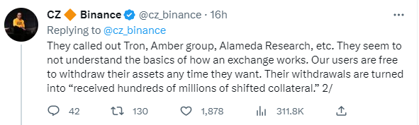 - Binance przekazał dziennikarzom CoinDesk, iż nigdy nie inwestowała ani nie korzystała z aktywów użytkowników bez ich zgody i przechowuje wszystkie aktywa swoich klientów na wydzielonych, odrębnych od własnych kontach;