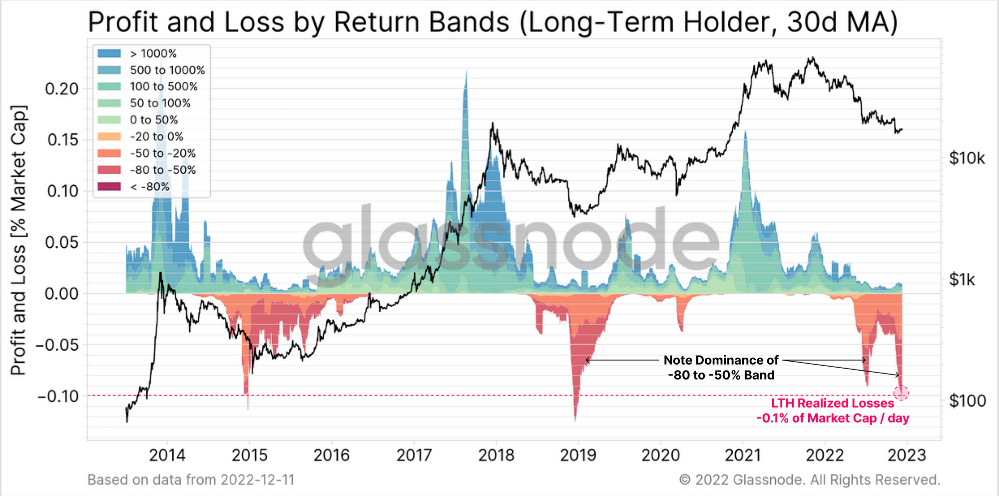 Długoterminowi inwestorzy (LTH) w 2022 roku kapitulowali dwa razy, akceptując potężne straty i sprzedajac rezerwy BTC w szybkim tempie. Najpierw podaż spowodowała implozja Luny i fatalny dla kryptowalut czerwiec, następnie listopad i upadek FTX. W poprzednim miesiącu dzienna podaż LTH wyniosła rekordowe 0,10% całkowitej podaży BTC w ujęciu dziennym. Gdy porównamy to z poprzednimi cyklami, tak intensywna podaż HODLerów zwiastowała bliskie odreagowanie i wyprzedanie rynki. Warto zestawić zrealizowaną przez LTH stratę z covidowej paniki 2020 roku, gdy wybuchała pandemia a rynki finansowe przeżywały wstrząs. W porównaniu z bessą 2022 roku jej skala (wówczas ogromna) wygląda słabo, co obrazuje poziom obecnego wyprzedania rynku i utrzymującej się na nim niepewności. Źródło: Glassnode