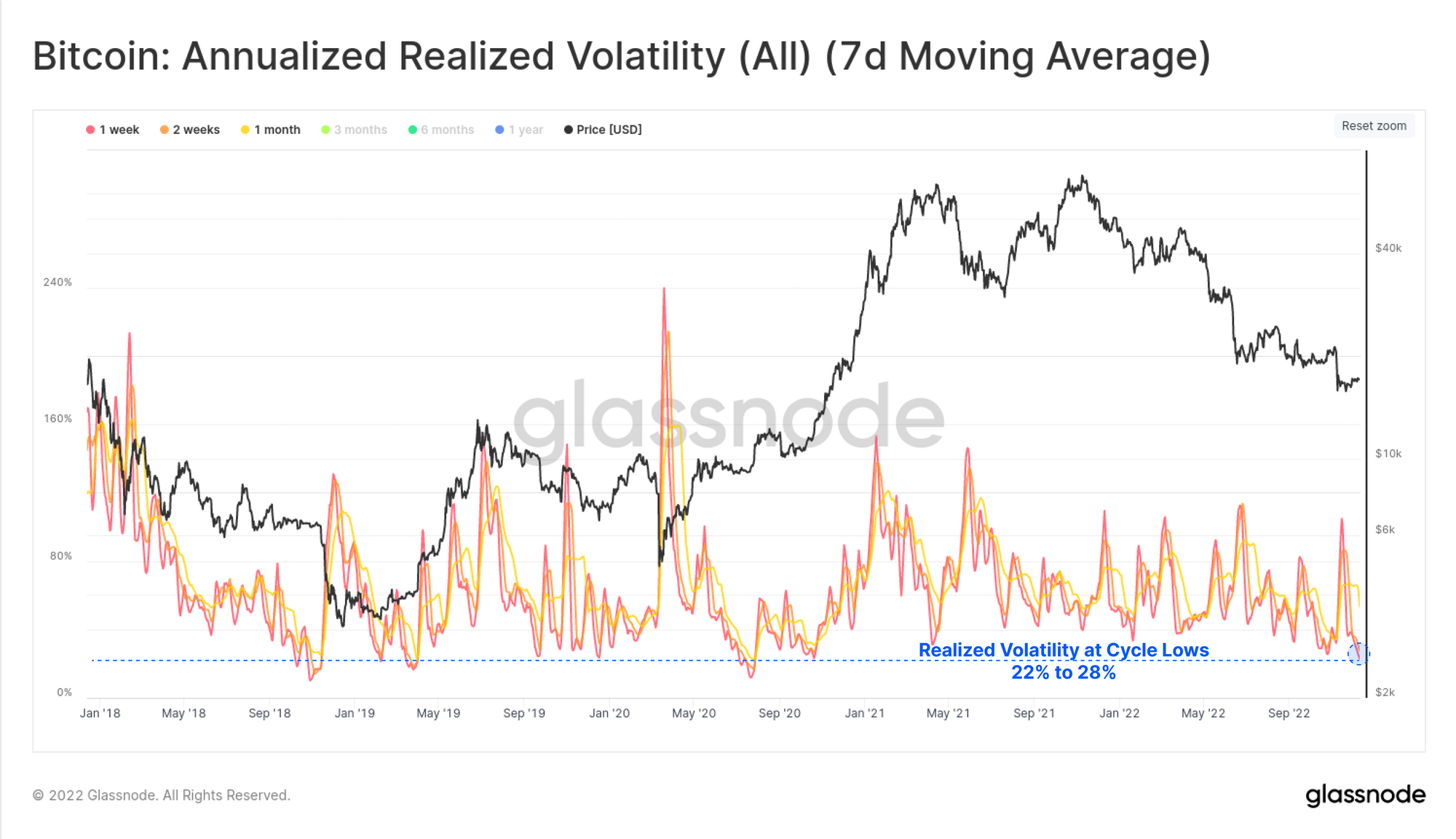 Poza wolumenem spadła też zmienność Bitcoina, bardzo znacząca – do okolic widzianych ostatnim razem w październiku 2020. Kiedy widzieliśmy je jeszcze? W listopadzie 2018 i maju 2019 roku. Patrząc na przeszle reakcje cenowe, kończyo się to zwykle wzrostami. Zmienność BTC sukcesywnie spada od czasu jego powstania, co wydaje się mieć swoje podstawowe uzasdnienie we wzroście kapitalizacji rynkowej. Od 2022 roku dochodzi jednak dodatkowy czynnik w postaci awersji do ryzyka i negatywnego sentymentu wobec niemal wszystkich aktywów ryzyka, również spółek technologicznych. Źródło: Glassnode