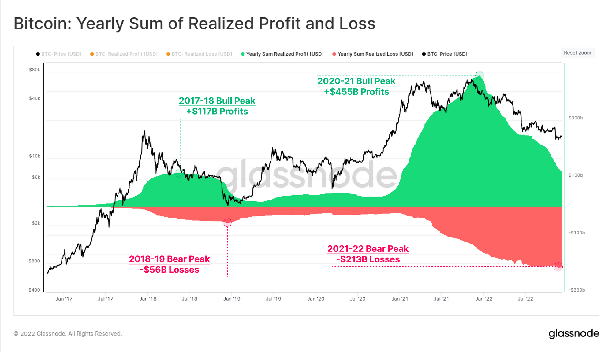 W czasie ostatniej hossy 2020-2021 inwestorzy zarobili prawie 4 krotnie więcej niż w poprzednim cyklu 201. Według Glassnode kupujący zanotowali blisko 445 mld USD zysku, daje to ilość ponad dwukrotnie wyższą od zrealizowanej od listopada 2021 roku straty. Ta oczywiście także okazała się rekordowa, 213 mld USD i podobnie do zysków, również okazała się 4 krotnie wyższe od bessy 2018-2019. Widzimy więc, iż proporcja zrealizowanych zysków i strat pokrywa się z poprzednią bessą. Teraz straty w relacji do zysków odpowiadają za mniej wiecej 46,8%. Na dnie poprzedniej bessy roku było to 47,9%. Źródło: Glassnode