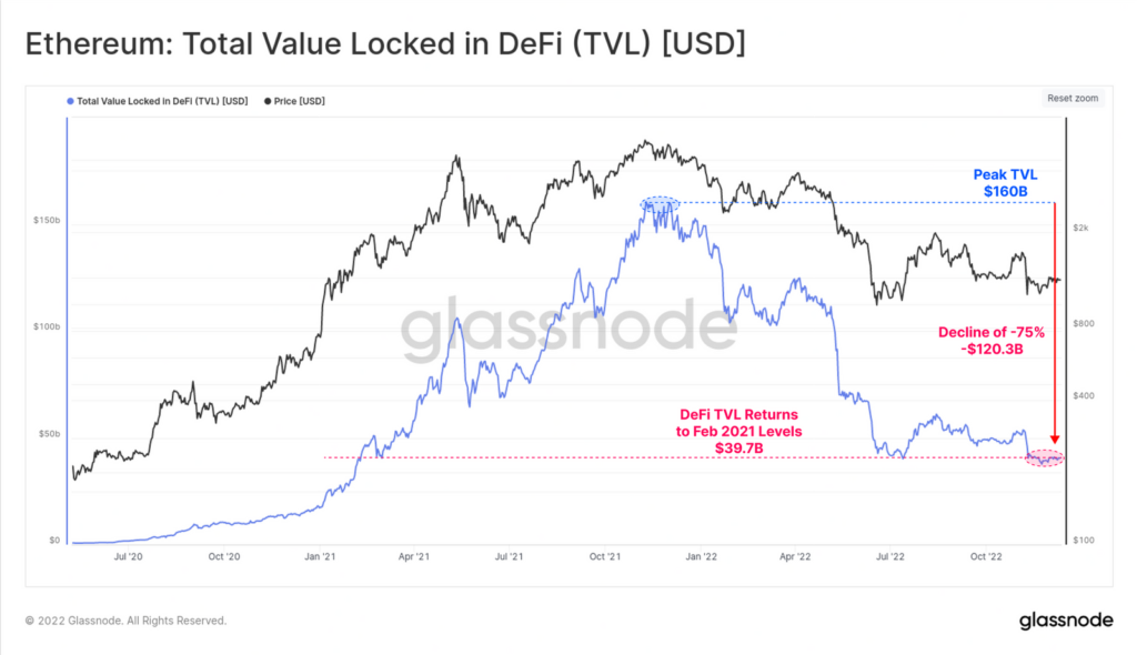 Wartość zabezpieczeń zdeponowanych w zdecentralizowanych finansach (DeFi) spadła drastycznie, o 75% ze 160 mld USD do zaledwie 40 mld USD, poziomów widzianych poprzednio w lutym 2021 roku. Źródło: Glassnode
