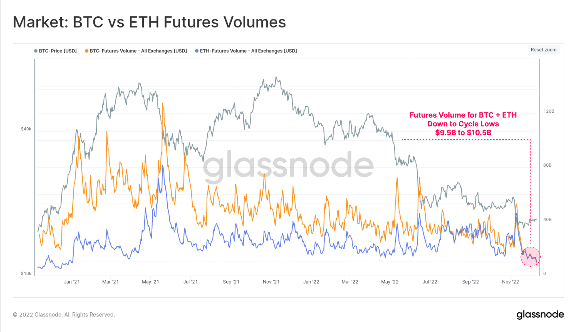 Denominowana w USD wartość spekulacyjnych pozycji na kontraktach terminowych Ethereum i Bitcoina spadła do poziomów niewidzianych od początku 2021 roku gdy rynek kryptowalut przyciągnął uwagę całego Wall Street i klientów dotalicznych wchodzacych na rynek przy słabej propozycji zysków z obligacji i lokat. Przez wysychającą płynność i niską zmienność można oczekiwać, iż następny ruch będzie gwałtowny. Sam spadek wolumenów futures wydaje się w gruncie rzeczy negatywny dla kryptowalut i pokazuje, iż spekulanci coraz mniejszą uwagę przywiązują do tracącego rynku BTC i ETH. Źródło: Glassnode