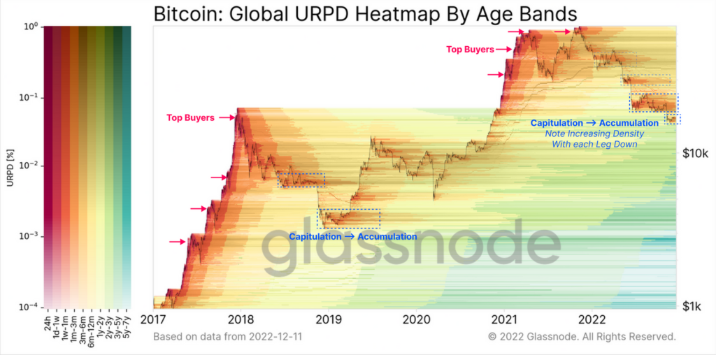 Ten wykres przedstawia intenswyność i rozkład podaży Bitcoinów, zależnie od ich przedziałów wiekowych. Ciepłe kolory wskazują na dużą dystrybucję starszych BTC, zwykle widoczne są w szczytach rynku oraz na dnie kapitulacji. Chłodniejsze kolory wskazują na dojrzewanie, gdy inwestorzy gromadzą i pozostawiają tokeny BTC jako niewydane. Ciemniejsze słupki wskazują większą intensywność akumulacji BTC. Po każdym spadku rynku w 2022 roku możemy obserwować wzrost intensywności redystrybucji monet (a tym samym ich ponownej akumulacji). W szczególności wyróżnia się strefa od czerwca do października 2022 r., z wieloma Bitcoinami nabytymi w okolicach między 18 tys. a 24 tys. USD. Tokeny te w tej chwili starzeją się do przedziału 6-miesięcznego + (stąd rosnąca podaż LTH). Źródło: Glassnode