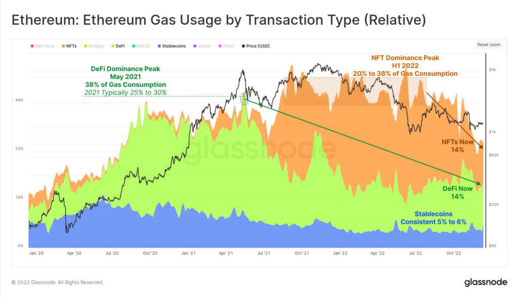 Patrząc na ilość spalanych gas fees widzimy, iż De-Fi ustępuje powoli pola na rzecz tokenów NFT podczas gdy jeszcze rok temu zdecentralizowane finanse były ich absolutnym dominatorem. W 2021 roku w szczucie konsumcji gas fees przez DeFi odpowiadały one za 38% opłat (średnio od 25 do 30%). Teraz rolę tą przejmują transakcje NFT, z bardzo podobnymi paramterami zużycia opłat sieciowych na blockchainie Ethereum. Stablecoiny stanowią ok. 5 do 6% opłat. Źródło: Glassnode