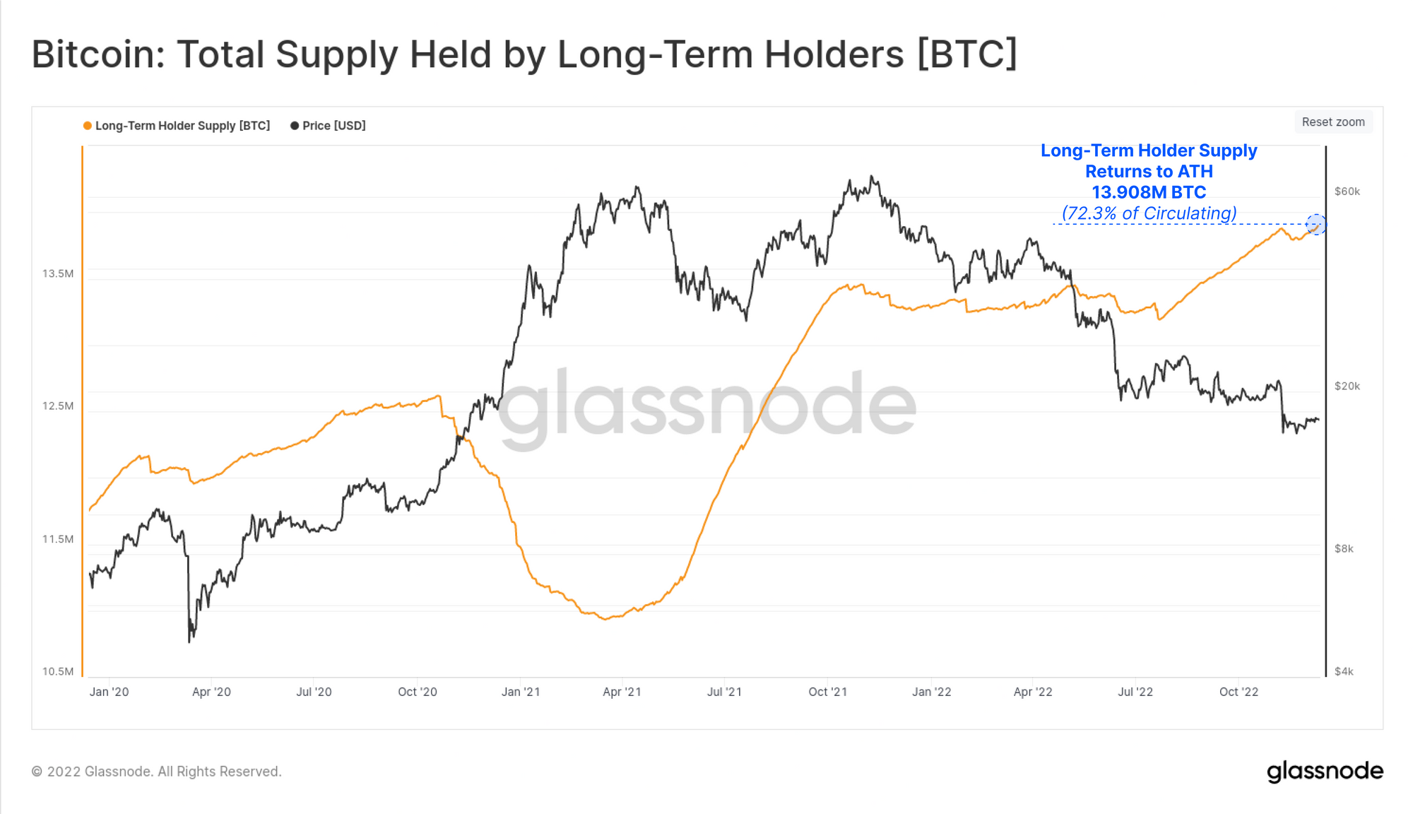 Mimo spadków w tym roku rezerwy BTC (podaż) posiadane przez Long Term Holders (LTH) sięgnęły historycznych szczytów. Długoterminowi inwestorzy posiadają teraz ponad 13,9 mln BTC tj. co stanowi blisko 72% całkowitej, dostępnej podaży Bitcoina. HODLerzy gwałtownie uporali się z upadkiem FTX i wrócili do akumulacji. Widzimy więc, iż rynek kryptowalut staje się powoli rynkiem inwestorów długoterminowych co objawia się spadkiem płynności i może zwiastować szok podażowy, ponieważ obecni są na nim inwestorzy o największym poziomie przekonania, statystycznie mało skłonni do upłynniania rezerw przed kolejną, domniemaną hossą. Źródło: Glassnode