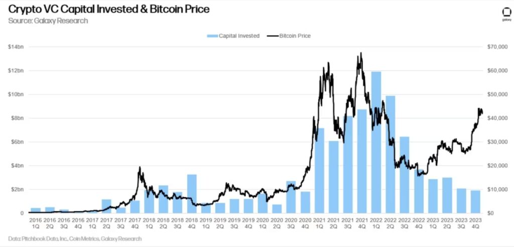 Jak twierdzi Miles Deutscher, podczas szalonej hossy zakończonej na jesieni 2021 r. rynek kryptowalut był świadkiem bezprecedensowego napływu płynności, napędzanego głównie przez świeży kapitał detaliczny. Byczy sentyment z kolei przyciągnął do sektora masę funduszy typu Venture Capital (VC), które wpompowały ogromne sumy pieniędzy w nowe, powstające i obiecujące start-upy. Najlepszy kwartał pod względem finansowania przez VC miał miejsce, jak się okazuje, na wiosnę 2022 roku – w sumie z kieszeni funduszy wpłynęło na rynek aż 12 miliardów dolarów.