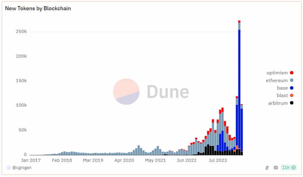 Taka sytuacja trwała do mniej więcej czwartego kwartału 2023 r., kiedy to warunki rynkowe zaczęły się gwałtownie poprawiać, co pociągnęło za sobą prawdziwy wodospad opóźnionych premier projektów. Sytuację dodatkowo skomplikowali nowi, dopiero co wkraczający na rynek gracze, w wyniku czego od kwietnia 2024 r. uruchomiono ponad milion (!) nowych tokenów, z czego połowę stanowiły kryptowaluty memowe (tzw. memecoiny) na taniej i szybkiej sieci Solana.