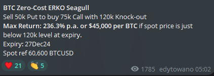W świetle powyższych danych zespół QCP Capital prognozuje, iż BTC może ponownie zyskać na wartości pod koniec bieżącego roku. Jedną z proponowanych strategii inwestycyjnych na rozegranie Bitcoina jest ich zdaniem tzw. BTC Zero-Cost ERKO Seagull, która zakłada sprzedaż opcji put na poziomie 50 000 USD, aby sfinansować zakup opcji call na poziomie 75 000 USD z poziomem knock-out na 120 000 USD. Maksymalny potencjalny zysk z tej strategii wynosi 236,3% rocznie, pod warunkiem, iż cena spot pozostanie tuż poniżej poziomu 120 000 USD na dzień wygaśnięcia, czyli 27 grudnia 2024 roku.
