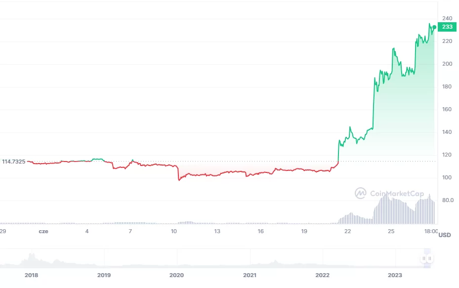 Tylko w ciągu ostatniego tygodnia cena $BCH poszybowała w górę osiągając na moment powstawania tego tekstu trzyletnie lokalne maksimum na poziomie 233 USD za sztukę. Wzrostom ceny Bitcoin Cash towarzyszył również drastyczny wzrost kapitalizacji całkowitej o ok. 2 miliardy dolarów amerykańskich. Całkowity market cap kryptowaluty wynosi aktualnie ok. 4,5 miliardów dolarów.