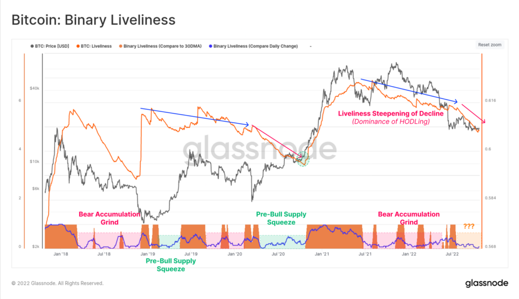 Ze wskaźnika Binary Liveliness możemy dowiedzieć się, iż dynamika spadku ceny zwalnia, potwierdzając, iż Bitcoin w miarę trwania bessy dostosowuje się do zachowań HODLerów. Starsi inwestorzy nie sprzedają Bitcoinów. Binarny oscylator żywiołowości rynku, który zestawia ostatnie spadki żywiołowości w relacji do jej kroczącej 30-dniowej średniej bazowej, jest na skrajnie niskim poziomie. Takie sytuacje w przeszłości miały miejsce bezpośrednio przed byczymi odreagowaniami, które powodowały destrukcję podaży i uwolnienie ceny. Miało to miejsce podczas wczesnej i średniej fazy akumulacji rynku niedźwiedzia (tzw. grind). Poziomy te pozostają zbieżne z ekstremalnym zachowaniem HODLing (rekordowe zakupy mimo bessy), zwykle obserwowanym podczas wczesnej i średniej fazy akumulacji rynku niedźwiedziego (grind).oraz bezpośrednio przed byczymi odwróceniami trendu (supply squeeze). Czy znajduejmy się w 'Pre-Bull Suplly Squeeze’? Źródło: Glassnode