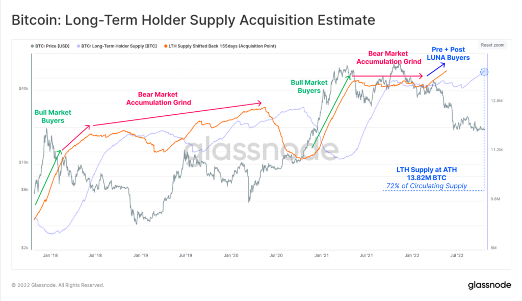 Wykres pokazuje, iż adresy długoterminowe nieustannie od lipca budują znaczące, bycze pozycje nieprzerwanie kupując Bitcoina. Akumulacja uprawdopodoabnia byczy scenariusz ponieważ w historii nie miała miejsca tak mocna akumulacja LTH przy jednocześnie olbrzymich wyprzedażach Bitcoina. 72% krążącej podaży jest w rękach LTH, co znaczy iż kapitulacja prawdopodobnie nie mogłaby odbyć się bez ich wkładu, który reprezentuje w tej chwili 13,82 mln BTC. Patrząc na cykle akumulacji widzimy podobieństwo do 2018 roku, najciekawsza jest bardzo silna tendencja zakupowa podczas załamania się Luny w maju tego roku. Mimo tak olbrzymich spadków (56%, licząc do wsparcia przy 18 000 USD), likwidacji lewarowanych pozycji i potężnych zawirowań makro, grupa LTH dodała rekordowe ilości Bitcoinów do portfeli co potwierdza ich niezachwianą wiarę w kolejny cykl hossy. Źródło: Glassnode