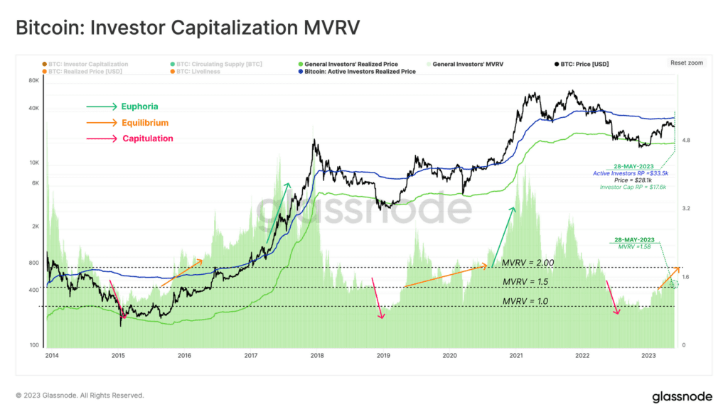 Glassnode próbuje użyć MVRV by wskazać na granicę potencjalnego spadku. Poszukajmy więc przybliżonego wsparcia makro w przypadku znacznego pogorszenia sytuacji. Wg. Glassnode może to być sytuacja podobna do krachu z marca 2020 r. W tym celu powstał Model Investor Cap Price – obliczany jako różnica między Realized Cap (średnią ceną nabycia BTC przez wszystkich) a Thermocap (model bazy kosztowej zasobów inwestoró, z wyłączeniem górników). Powyższy model Glassnode Investor Price został tylko na chwilę przecięty podczas wyprzedaży w marcu 2020 r.. Teraz notowany jest na poziomie 17,65 tys. dolarów. Przy MVRV wynoszącym w tej chwili 1,58, mieści się on w bardzo podobnym zakresie równowagi do mini cyklu rynku 2019-20 (strzałko czerwona i pomarańczowa).