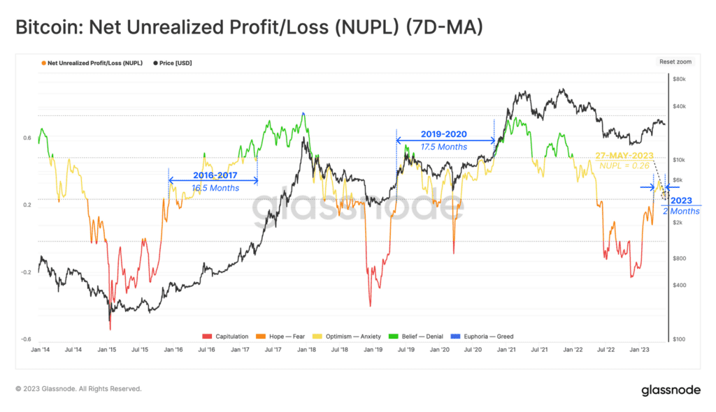 Źródło: GlassnodeNiższa zmienność i niższa aktywność w blockchainie wskazują na pewnego rodzaju fazę równowagi. Aby zweryfikować tę hipotezę, Glassnode wykorzystał wskaźnik niezrealizowanego zysku/straty netto (NUPL). To właśnie on wskazuje denominowaną w USD wartość całkowitego zysku lub straty jako % kapitalizacji BTC. W tym miejscu platforma analityczna wyznaczyła cztery fazy cyklu NUPL.