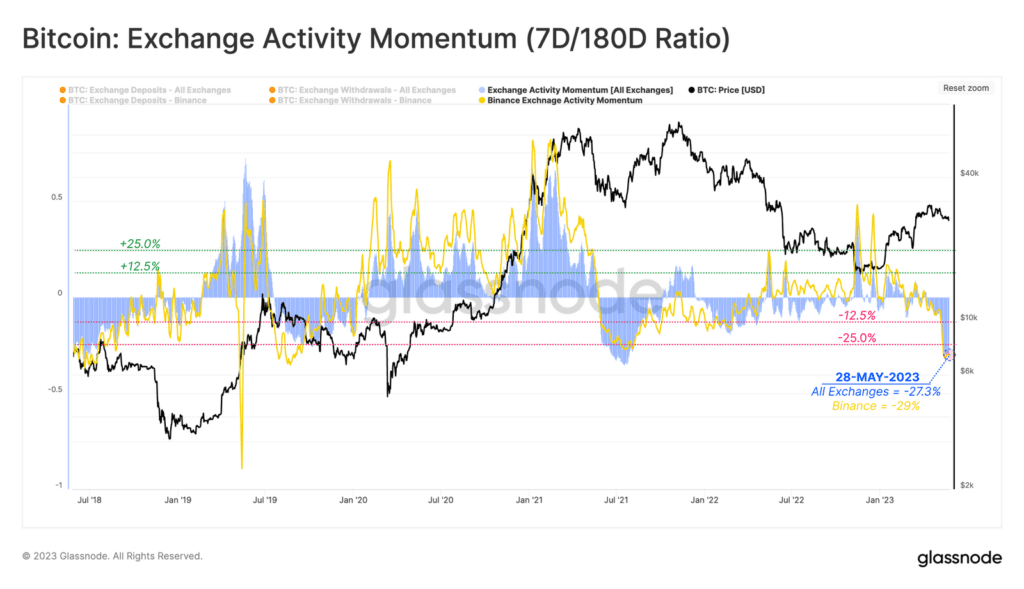 Źródło: GlassnodeWolumeny transferów w łańcuchu pozostają niskie. To przekłada się na ogólny spadek aktywności związanej z giełdami. Glassnode zestawia więc liczbę transakcji wpłat/wypłat na giełdzie ze średnią z 6 miesięcy. W ten sposób powstaje wskaźnik aktywności. Powyżej widać cykliczny trend aktywności giełdowej, a ostatnio aktywność spadła o ponad 27% w stosunku do średniej z sześciu miesięcy. Aby uwzględnić FTX, który zakończył działalności w listopadzie 2022 r., Glassnode dostrzega podobną dynamikę aktywności tylko dla Binance. Wskazuje to, iż aktywność inwestorów jest w tej chwili wyjątkowo niska.