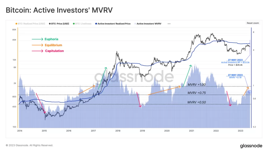 Źródło: GlassnodeGlassnode chce wykorzystać zestaw średnich cen zakupu BTC, by określić prawdopodobne granice zmienności w najbliższym czasie. Gdzie zatem leży psychologiczne equlibrium cenowe? Średni koszt zakupu BTC przez aktywnych inwestorów to w tej chwili ok. 33,5 tys. USD. Uwzględnia on wyłącznie aktywnych inwestorów i może oznaczać krótkoterminową górną granicę wzrostów. W tej strefiemoże pojawic się mocna podaż. Przy MVRV na poziomie 0,83 cena wskazuje, iż wielu kupujących w cyklu 2021-22 przez cały czas znajduje się w stratach i może czekać na osiągnięcie progu rentowności. Tylko po to by zlikwidować swoje pozycje na 'break even’ i zadowolić się brakiem strat.