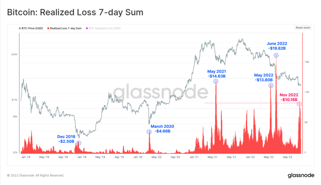 Historycznie stale powtarzającym wydarzeniem, które poprzedzało przejście z rynku niedźwiedzia z powrotem do rynku byka była dramatyczna realizacja strat tj. totalna kapitulacja, wyczerpanie inwestorów. W listopadzie miało miejsce czwarte największe wydarzenie kapitulacyjne w historii, odnotowując 7-dniową zrealizowaną stratę w wysokości 10.16 mld USD. Było to to 4 – krotnie większe niż szczyt z grudnia 2018 r. i 2,2 krotnie większe od covidowego załamania w marcu 2020 r. Patrząc na bezprezdensową ilość masowych kapitulacji w latach 2021 – 2022 trudno oprzeć się wrażeniu, iż spadkowy trend może zacząć się wyczerpywać. Źródło: Glassnode
