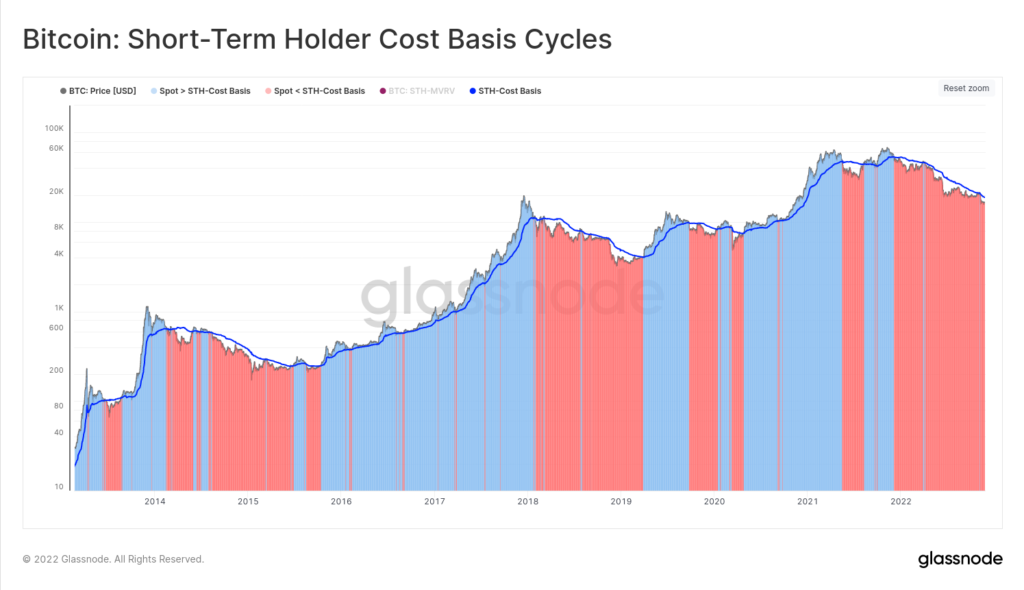 Stres finansowy rynku Bitcoina można badać z perspektywy nowszych inwestorów. Obserwując relację pomiędzy bazą kosztową (realized price) posiadaczy krótkoterminowych a ceną spot, można zaobserwować następujący wzór w cyklach Bitcoina. Na rynku byka (niebieski) średnia cena nabycia nowo zakupionej podaży jest konsekwentnie w zysku. W rynku niedźwiedzia stale trwające spadki powodują, iż baza kosztowa nowych inwestorów znajduje się ostatecznie powyżej ceny spot co wskazuje również, iż dno Bitcoina w każdym cyklu znajduje się zwykle niżej niż oczekuje rynek.Obecnie podstawa kosztowa krótkoterminowych inwestorów znajduje się na poziomie 18,83 tys USD, przeciętny krótkoterminowy nabywca jest więc na blisko 10% stracie. Źródło: Glassnode