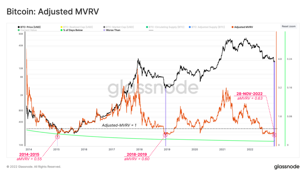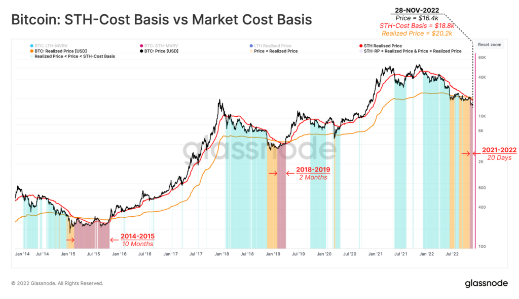 W dzisiejszym wpisie skoncentrujemy się na twardych danych on-chain dostarczanych przez firmę analityczną Glassnode. W czasie gdy większość rynku spodziewa się spadków w okolice 14 000 USD i niżej Bitcoin wykazuje się relatywnie dużą siłą – mimo bankructwa FTX nie stracił procentowo porównywalnie znacząco z pozostałymi, największymi wyprzedażami ostatnich lat. Historycznie inwestorzy statystycznie najczęściej mylili się co do dwóch rzeczy: