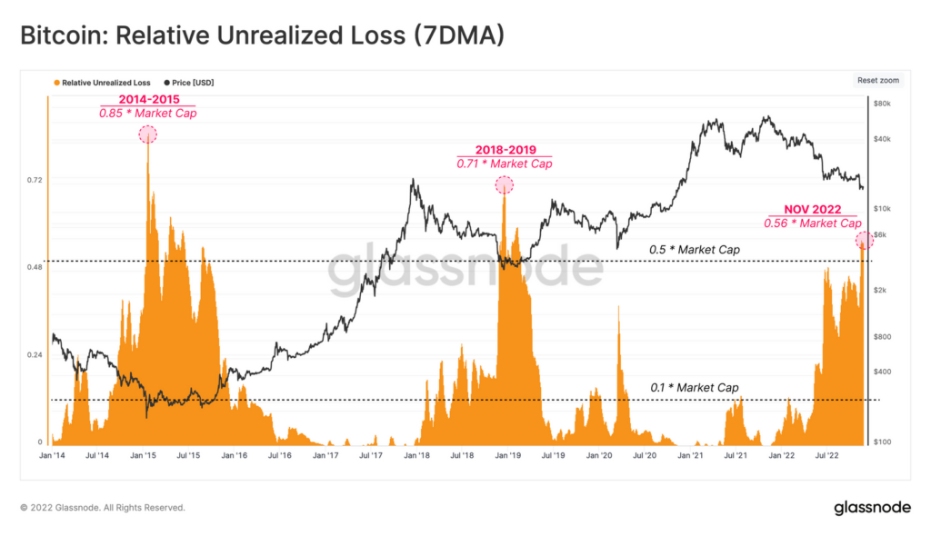W następstwie sytuacji z FTX widzimy, iż w tej chwili rynek jest w tej ostatniej, wyżej opisywanej fazie. Bardzo znacząca ilość BTC zmieniła teraz właścicieli, po znacznie obniżonych cenach.Możemy również określić wielkość niezrealizowanej straty w stosunku do wielkości rynku. Względna niezrealizowana strata mierzy zagregowaną stratę wciąż posiadaną przez szeroki rynek, w porównaniu do całkowitej kapitalizacji rynku. Śledzenie średniej tygodniowej tego wskaźnika pokazuje, iż w skrajnych punktach poprzednich rynków niedźwiedzia, inwestorzy ponosili straty przekraczające 50% całkowitej kapitalizacji rynku w tym czasie. Wskaźnik ten osiągnął ostatnio nowe maksima na poziomie 56%, co jest najwyższym wynikiem w obecnym cyklu i porównywalnym z poziomami z poprzednich rynków niedźwiedzia sygnalizujać nieuchronne odreagowanie w 2023 roku jeżeli Bitcoin utrzyma swoją cykliczność i powtarzające wzroce cenowe. Źródło: Glassnode