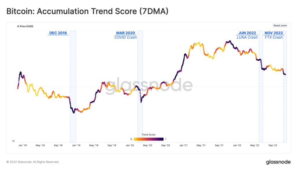 Cena BTC od ponad 4,5 miesiąca znajduje się poniżej ceny zrealizowanej (podstawy kosztów czyli średniej ceny nabycia BTC w łańcuchu bloków). Patrząc historycznie koreluje to z fazą tzw. odkrywania dna, która może być wizualizowana i oceniana dzięki metryki Accumulation Trend Score – przedstawia ją powyższy wykres. Metryka ta wskazuje zmianę salda podmiotów w ciągu ostatnich 30 dni przy czym skala reprezentuje zarówno wielkość zmiany salda jak i jej kierunek (od akumulacji po dystrybucje). Wartości bliskie 1 (kolor fioletowy) wskazują iż duża część BTC akumuluje Bitcoina i zwiększa salda. Wartości zbliżone do 0 (kolor żółty) wskazują iż większa część rynku sprzedaje Bitcoiny i zmniejsza salda. Ostatni silnu wynik akumulacyjny po niedawnym wyprzedaniu przypomina końcówkę 2018 roku. Zmiana zachowania może być widoczna bezpośrednio związanych z wyprzedażą jak krach Covid, implozja Luny, czerwiec 2022 czy okres od listopada do grudnia 2018 roku, który zakończył się 50% spadkiem Bitcoina. Źródło: Glassnode