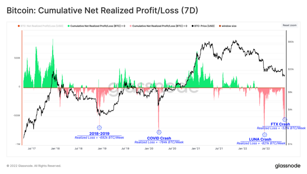 Ostatni wykres pokazuje 7-dniową skumulowaną zrealizowany zysk/stratę netto denominowane w BTC na tle poprzednich cykli. Co dość niezwykłe, w ciągu ostatniego tygodnia rynek zrealizował stratę netto równą 521 000 BTC, ponownie bliską największej w całej historii. Mimo to porównując w tej chwili skumulowaną stratę netto do poprzednich krachów (Covid i Luna) z odpowiednio 44% i 39% spadkiem ceny rynek wykazał się bardzo dużą siłą wykonując 26% 'korektę’ mimo upadku jednej z największych kryptowalutowych giełd świata i lawiny niepewności która obiegła cały rynek. Przez kontrariańskich inwestorów może być to postrzegane jako oznaka 'ostatecznego wyprzedania’ rynku kryptowalut. Źródło: Glassnode