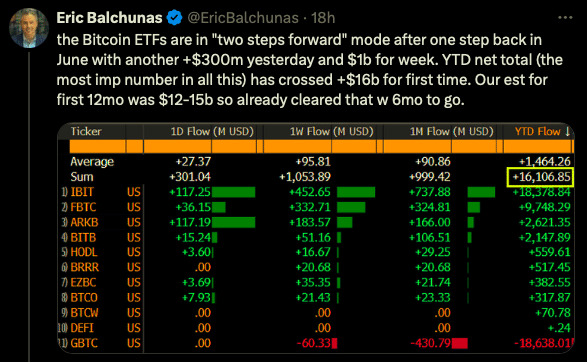 Pierwszy raz w historii spot Bitcoin (BTC) exchange-traded funds (ETFs) przekroczyły roczne napływy netto w wysokości 16 miliardów dolarów. Informację tę podał analityk ETF Bloomberg, Eric Balchunas. Określił ten ruch jako „dwa kroki naprzód, jeden krok wstecz”, odnosząc się do słabszych wyników w czerwcu.