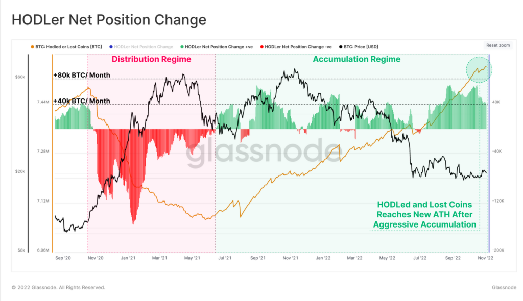 Długoterminowi inwestorzy tzw. HODLerzy adekwatnie budują rynek Bitcoina i dzięki nim kryptowaluty prawdopodobnie zmierzają w kierunku nowej hossy. Zmiana pozycji netto na wykresie odzwierciedla 30-dniową zmianę podaży Bitcoinów należących do długoterminowych inwestorów oraz tych zgubionych, do których 'klucze’ już prawdopodobnie przepadły. Patrząc na poziomy z maja tamtego roku możemy zaobserwować: Przed punktem zwrotnym (czerwony) miały miejsce agresywne wyprzedaże długoterminowych inwestorów, którzy realizowali znaczące zyski, w trakcie tego procesu z okresu 2021 roku długoterminowi inwestorzy sprzedali blisko 450 tys BTC (średnio 150 tys. miesięcznie od lutego do maja 2021). Patrząc na zachowanie akumulujących LTH – przeciwnie niż w hossie, mają oni skłonność do dużych zakupów gdy cena spada. W ciagu ostatnich 8 miesięcy ta grupa inwestorów zwiększyła całkowite zasoby o 500 000 BTC, daje to ok. 40 000 BTC w skali miesiąca. Na tej fali ilość BTC posiadanych przez LTH osiągnęła historyczne szczyty. Źródło: Glassnode