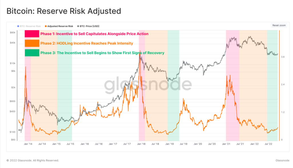 Metryka Adjusted Reserve Risk, może być cyklicznym oscylatorem określającym równowagę pomiędzy zachętą do sprzedaży, a rzeczywistymi wydatkami długo niedotykanych przez inwestorów Bitcoinów. Widzimy, iż Ajusted Reserve Risk w ostatnim czasie wzrosło, a realizacja zysków staje się podstawowym mechanizmem działania rynku w bessie (inwestorzy STH). Warto jednak wziąć poprawkę na fakt, iż zdecydowana, rekordowa ilość inwestorów jest stratna i posiada prawdopodobnie niewielką motywację do zamknięcia stratnych pozycji. W podobnym położeniu są też adresy LTH, które niemal na pewno nie będą skłonne akceptować strat i będą czekały ze sprzedażą na dużo wyższe poziomy cenowe – tak jak robiły to do tej pory. Glassnode dzieli rynek na trzy fazy. Czerwona pokazuje rynek, który łamie przekoniania krótkoterminwocyh traderów, zniechecając ich do spekulacji ceną Bitcoina, nagradza długoterminowych inwestorów oraz tych akumulujących kryptowalutę po niższych cenach. Zachęta do sprzedaży jest wówczas niewielka. W fazie drugiej zaznaczone jan pomarańczowo widzimy, iż okres sprzedaży przez krótkoterminowych inwestorów mija, a HODLerzy przejmują przysłowiową pałeczkę, dno bessy ostatecznie mija. Ostatnia faza, zaznaczona na zielono (według tej metryki – aktualna) pokazuje oznaki ożywienia jak m.in. nowy popyt, uformowanie dna czy realizację zysków, która nie jest w stanie przytłoczyć byków. Z drugiej strony jednak możemy zakładać, iż wejście w fazę zieloną w otoczeniu niepewności na rynkach finansowych może zwiastować skłonność do realizacji zysków przez inwestorów STH oraz potencjalnie również chęć wyjścia częścią kapitału przez długoterminowych inwestorów. Faza ta może się jednak prawdopodobnie wyłącznie przedłużyć, historycznie sytuacja w której po zielonej fazie ponownie nastepowała faza czerwona nie miała miejsca. Możemy zatem założyć, iż Bitcoin w najbliższych dniach pozostanie bardzo wrażliwy na ogólną atmosferę rynku. Głównym wydarzeniem będzie reakcja Wall Street po odczycie inflacji z USA, poznamy ją w czwartek i wówczas należy spodziewać się wyższej zmienności rynku kryptowalut. Źródło: GlassnodeDroga żółwia