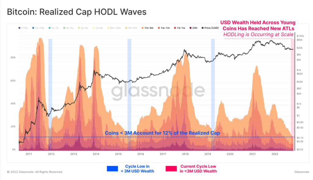 Popatrzmy ile wynoszą rezerwy inwestorów wyrażone w dolarach amerykańskich, w zależności od wieku posiadanych przez nich BTC. W tym przypadku kryptowaluty młodsze od 3 miesięcy zostana na potrzeby analityczne przez Glassnode określone jako 'zasoby inwestorów spekulacyjnych’. Zasoby posiadane w tej chwili przez 'młodych inwestorów’ znajduje się dziś na najniższym poziomie w histori, wynosi zaledwie 10% sieci Realized Cap. Widzimy więc, iż zasoby BTC starsze niż 3 miesiące, osiągnęły zdecydowanie ATH zarówno w kategoriach względnych wobec krótkoterminowych inwestorów jak i bezwzględnych patrząc na tzw. Realized Cap sieci Bitcoina. Widzimy więc, iż dominacja HODLerów jest dosłownie przytłaczająca i dominuje. Inwestorzy ci nie chcą sprzedawać mimo zawierowań na rynkach finansowych. Wciąż przeprowadzają akumulację mało wrażliwi na zewnętrzne okoliczności rynkowe. Źródło: Glassnode