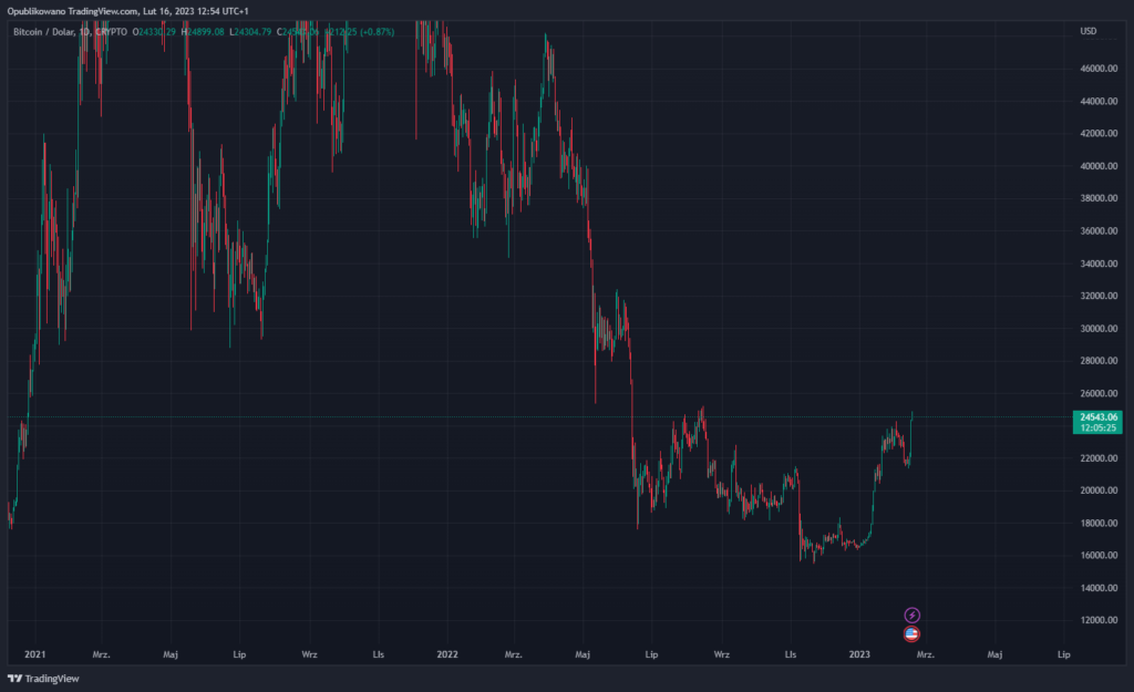 Dane dostarczone przez TradingView pokazują, iż po krótkim wycofaniu się we wczesnych godzinach handlu w środę, cena Bitcoina (BTC) wzrosła po południu, gdy byki przejęły kontrolę nad akcją cenową i pchnęły największą kryptowalutę do dziennego maksimum 24 285 USD, najwyższego poziomu od 1 lutego. W piątek kurs BTC kontynuuje wzrosty notując swoje maksimum w okolicach 24 900 USD.
